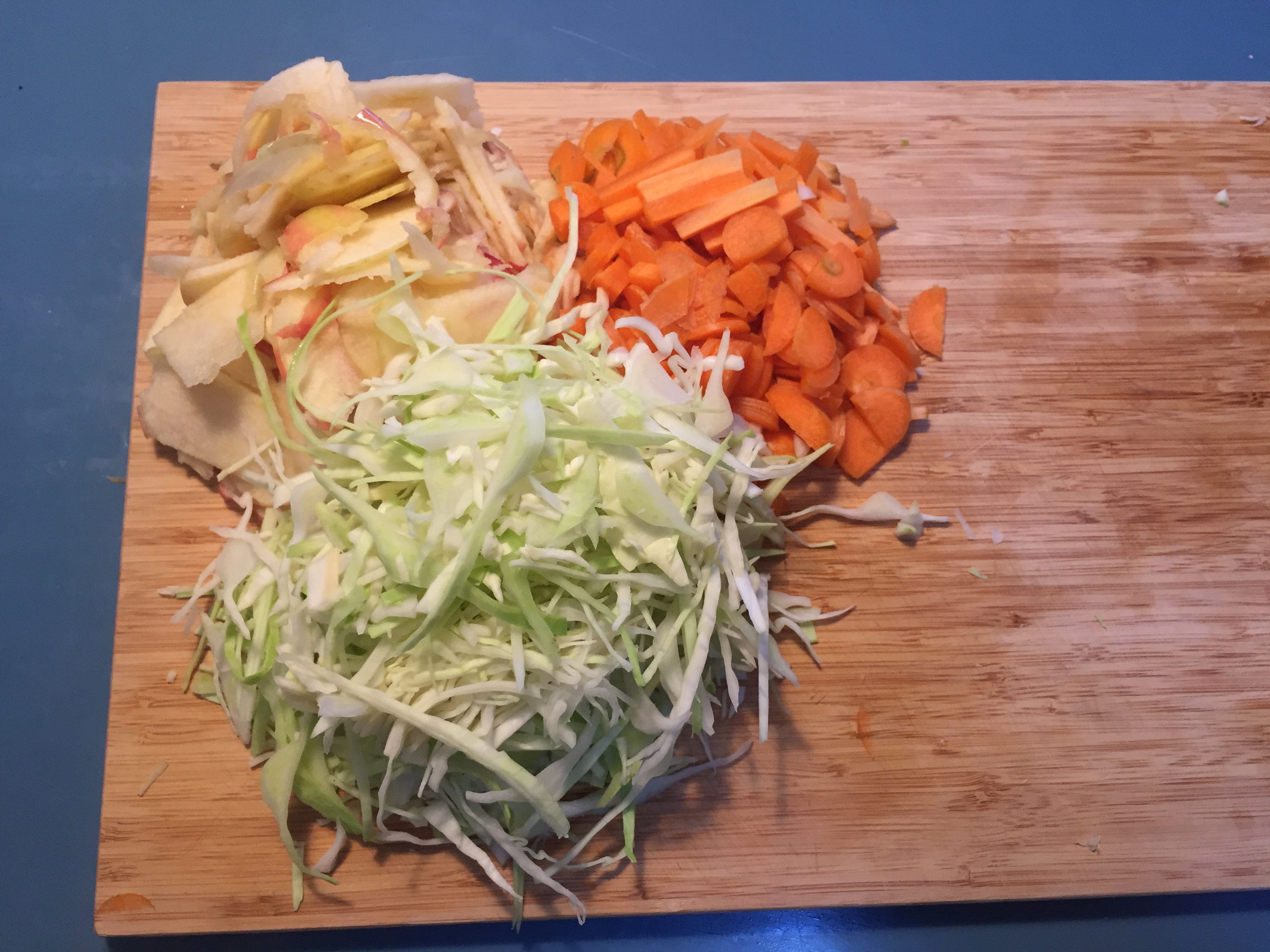 For this recipe I used half a cabbage, two apples and two large carrots. This enabled me to fill the two glass mason jars pictured above. To begin with I finely chop the cabbage. Personally I prefer the texture of the cabbage finely chopped but any size will do. Next chop the carrots into small pieces. There is no need to peel the carrots before hand as the carrot skin contains many wonderful lactic acid forming bacteria. I grated the apple using the slicing slots of a kitchen grater. Combine the cabbage and carrots into a bowl and add the salt, I used a teaspoon of salt but always taste to see if you need to add anymore. Salt has many uses in the fermentation process one is to keep your veg nice and crunchy whilst it ferments. Now comes the fun part where you mix, massage and press the contents together to get the juices out of the veg. The salt also helps to pull out the liquids from the vegetables. Do this for roughly 5-10 minutes. After this add the apple and a generous amount of black pepper corns, mix well together. Add the contents to your glass jars and press firmly down to remove any air pockets and to submerge everything in the juices as much as possible. Leave to ferment for a 3-5 days, it should start bubbling away. I usually refrigerate after 3 days otherwise I find it can become too sour. To note, it’s always best to use organic vegetables as they don’t contain pesticides, the chemicals in pesticides can have a negative effect on the lactic acid producing bacteria found on the vegetables and deter vegetables.